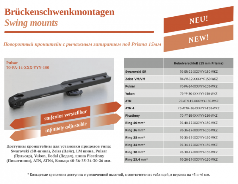 Устройство оснащено запирающей системой MAK, обеспечивающей быструю установку и снятие прибора ночного виденья без потери первоначальной пристрелки. Высота передней опоры может составлять 2, 4, 6 или 10 мм, а задней - регулируется корректирующими шайбами от 1 до 15 мм.