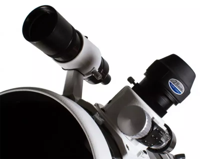 В комплекте поставки вы найдёте всё необходимое для начала работы: широкоугольный окуляр 28 мм с посадочным диаметром 2 дюйма, переходник на 1,25 дюйма, оптический искатель 8×50 для быстрого наведения на объекты, Т-адаптер для подключения фотокамеры. Также предусмотрены крепёжные кольца, монтажная пластина и подробная инструкция по эксплуатации с гарантийным талоном.